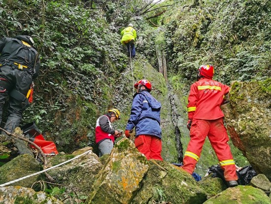 1月2日,南宁市戏台峰,南宁市红十字搜救救援队队员正在搜救。山里地形复杂,搜救人员绳降而下。陈贵禧/摄