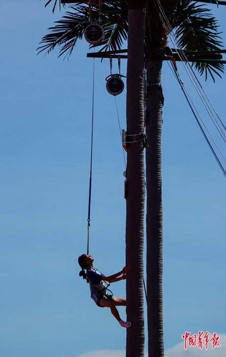“单脚蹬腿上树叫‘飞毛腿’、向上的动作叫‘青蛙跳’。”17岁的符诗军原本是短跑选手,小时候总幻想自己能上树摘椰子。她记得,十四五岁第一次接触攀椰是抱着“树”一点点蹭上去的,加强训练后,改了技术动作,她在本次比赛中创造了6秒582的最好成绩。