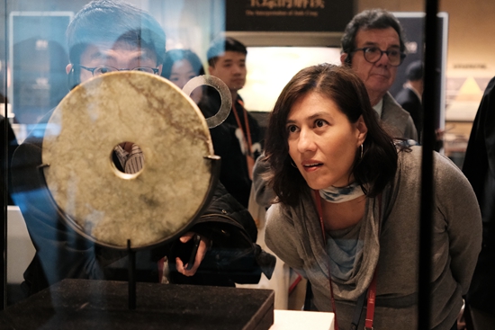 11月25日,浙江杭州良渚博物院,考古学家在良渚玉璧前驻足细看。当日,第二届“良渚论坛”在杭州开幕,吸引了60余个国家和地区的考古学家、作家、音乐家等300余名中外嘉宾参加,旨在促进世界不同文明之间的交流互鉴。中新社记者 曹丹/摄(视觉中国供图)