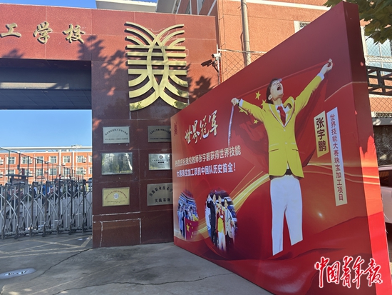 北京市工艺美术高级技工学校教师张宇鹏夺得第47届世赛珠宝加工项目金牌,学校门口立起获奖海报。中青报·中青网记者 李桂杰/摄