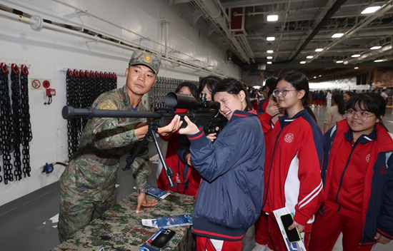 在香港就读小学的梁宇涵对武器装备非常感兴趣,在官兵指导下,他体验了狙击步枪瞄准过程,他说:“我感觉这把枪很重,但教我的海军哥哥很熟练地就把它组装好,不知道要训练多少次,才能看起来如此轻松,海军哥哥太厉害了!”