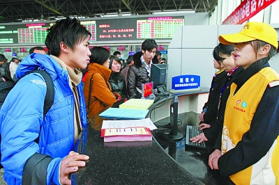 2月11日,重庆龙头寺火车站“旅客出行设计”服务台,一位准备外出打工的青年向工作人员和志愿者咨询票务信息。据介绍,春运以来,重庆车站为最大限度地方便旅客购票出行,特别在售票大厅内增设了“旅客出行设计”服务台,为坐火车的旅客推荐最佳出行方案,介绍最快捷的车次、最经济的换乘方案,售票工作人员变身“出行顾问”,主动为旅客提供温馨服务。
