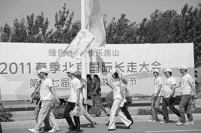 本报讯(记者鄢光哲文并摄)以“绿色北京、快乐房山”为主题的“2011春季北京国际长走大会”14日在北京房山区长沟鸣鼓召开,来自机关、企业、高校、社区等各行业代表以及社会各界人士和外国友人共万余人参加了长走大会。