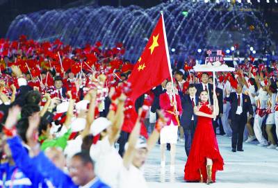 北京吉利大学学生苗豆豆在广州亚运会开幕式上引导中国代表团入场