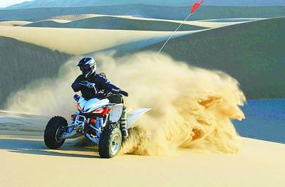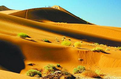 汤姆冲着最高的沙丘冲了上去,然后将车缓缓地停在沙丘最高的边缘,前轮已经向着沙丘的另一侧倾斜下去。车上的人一阵惊呼,汤姆大笑:“现在我要熄火了,等一会儿我们就从这里滑下去。”汤姆果然将车子向前又开了不到10厘米,就熄火了。我们的车子由慢变快向沙丘另一侧的陡坡滑下去,汤姆说:“听,沙漠在唱歌了。”侧耳听去,果然听到了鸣沙声。