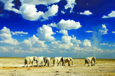 午后的太阳异常炙热,广阔的草原显得十分安静,在广阔的草原寻找我们期待的野生动物简直就像大海捞针,经验丰富的向导莱斯利告诉我,此时的动物都处于缺水状态,最好的办法就是赶往水源地碰碰运气了。我们沿着公园里的土路以每小时60公里的速度行驶,突然前方的路被一排羚羊阻挡了,原来路旁的两棵树投下的阴影成了它们的遮阳伞,羚羊一字排开,躲在下面乘凉。远处的一头大象则把头伸进一棵小树的阴影下,以躲避难耐的高温。一只长颈鹿正把头俯得很低喝水,对这样长腿、长脖子的动物来说,俯身喝水并不是件容易的事。不过,长颈鹿对我们的汽车高度警惕,当我们的车子减速,慢慢靠近它时,它飞快地迈着长腿从我们面前消失了。一阵烟尘中,几头大象走近水源地,步履缓慢、从容。大象们的身体几近盐湖的白色,映衬在朵朵白云下。眼前的一切,仿佛神话中的某个场景。
