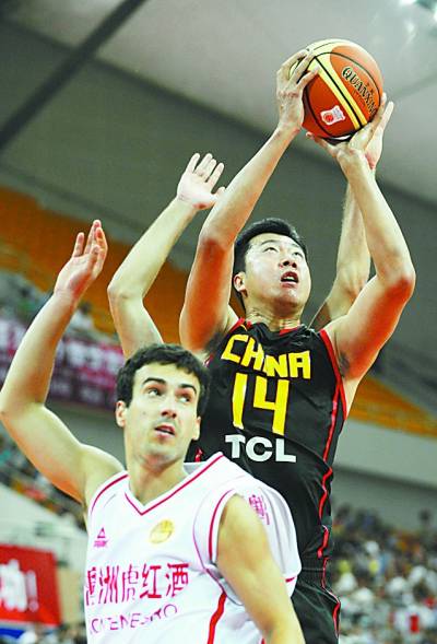 7月10日,中国男篮在江苏省昆山市举行的2011年四国男篮对抗赛中,以75∶72战胜黑山队。图为中国队球员王治郅(右)在比赛中进攻。