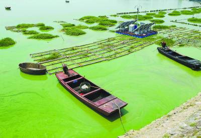 7月9日拍摄的被蓝藻染绿的安徽巢湖东半湖湖面。