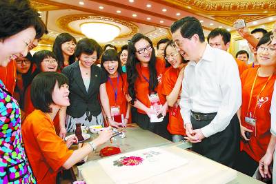 下午3时许,胡锦涛总书记来到人民大会堂东大厅,走到两岸青年中间。惊喜不已的青年们围拢过来,争相向总书记问好。胡锦涛和蔼可亲地同两岸青年打招呼,并在大家簇拥下走向正在演示传统技艺的展台。