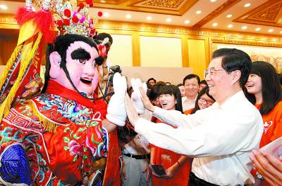 胡锦涛在台湾民间流行的“电音三太子”表演结束时高兴地同演员相互击掌。
