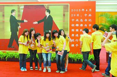 两岸青年纷纷在本报记者贺延光拍摄的《两党一小步 民族一大步》照片前留影。