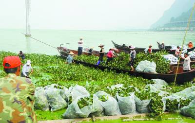 7月10日,村民在滇池畔打捞水葫芦,准备将其投放至定点的围网内。