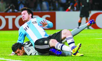 7月12日,阿根廷队在美洲杯小组赛最后一场比赛中,以3∶0击败哥斯达黎加队。图为阿根廷队球星梅西(上)在比赛中。