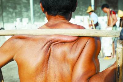 日复一日地挑砖,周光福的后脖子下,被压出一道深深的印子。挑起砖后,扁担就深陷在这道痕迹里,后背上则堆起一道肉。他还不是最严重的,卢秋发的印子更深。每一个挑夫身上都有岁月和劳作刻下的痕迹,不是深深的印子,就是一块块伤疤。