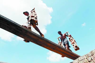太阳已经开始烤炙大地。这是6月27日,一早刚下过雨,水汽一蒸腾,潮热熏人。在太阳下站上几分钟,裸露的皮肤就会感到火辣辣地疼。挑砖的人更是辛苦,一会儿工夫,全身就湿透了,像从水里捞出来。