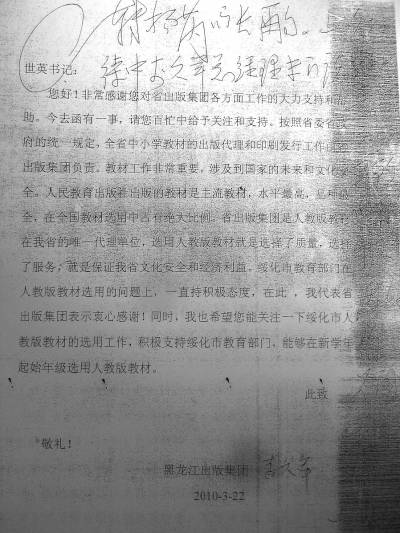 (图2)黑龙江出版集团2010年3月22日发给绥化市某领导的函。