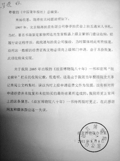 连日来,面对“私自拍卖馆藏五件宋代书札”的质疑,故宫博物院方面均予坚决否认。8月5日,故宫新闻发言人冯乃恩正式向各媒体表示:“故宫博物院从未竞买、收藏过网帖中所称的5件北宋名人书札,更不存在私自拍卖藏品一说。”该说法与此前故宫博物院公共关系科,给予中国青年报的答复相一致。