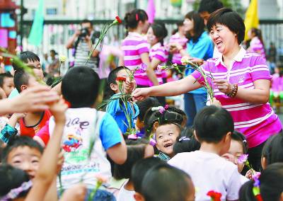 9月8日,北京东城区第二幼儿园举行教师节拜师会。热闹的互动游戏中,小朋友向老师送上鲜花和自制的花环,表达对老师的感谢。