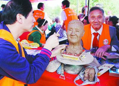 10月15日,民间艺人“泥人胡”(左)在为老义工塑像。当日,“金报周末义工队”百期专场大型公益活动在湖北武汉汉口江滩举行,来自武汉三镇的千余名义工汇集这里,为广大市民开展40多项免费服务,数十位民间艺人现场献艺,受到市民热捧。新华社记者 俞俭摄