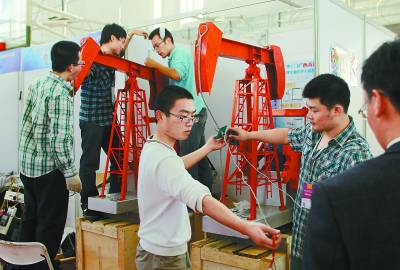 10月15日,第十二届“挑战杯”全国大学生课外学术科技作品竞赛终审决赛即将进行,中国石油大学的同学正在大连理工大学刘长春体育馆内紧张布展。