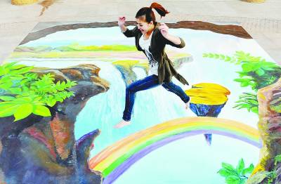 10月17日,郑州市郑东新区奥特莱斯购物中心门前,画师凡迪创作的巨型3D立体彩绘吸引了许多人的眼球,一个女孩正在一幅模仿电影《阿凡达》场景的立体画面上“跨越极限”。CFP供图