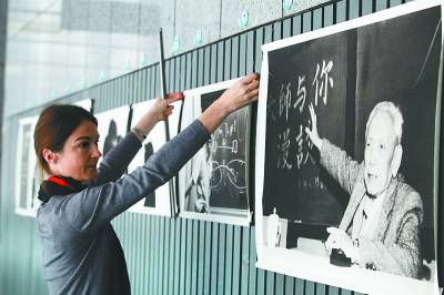 10月24日,法国工作人员在布展。法国高等科学研究所为纪念陈省身先生诞辰100周年,在南开大学举办著名数学家图片展。