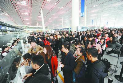 10月30日,在首都国际机场T3航站楼等候改签的旅客排成长队。