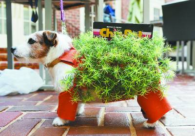 10月27日,在美国弗吉尼亚州的亚历山德里亚市的一家旅馆,一只参加万圣节装扮宠物狗大赛的小狗被装扮成一株植物。