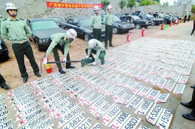 10月30日,在广西南宁警备区集中销毁假冒军车仪式上,被依法查扣的21辆违规悬挂伪造军车号牌的小轿车、摩托车被集中强制毁型报废处理。今年以来,南宁警备区先后查处了70多辆违规悬挂伪造军车号牌的地方车辆,收缴伪造军车号牌300多块。