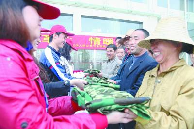 10月31日,湖南省衡阳市一建筑工地,南华大学的志愿者把军训服装送到农民工手中。志愿者把同学们参加军训所使用的军训服装征集起来,送给周边建筑工地的农民工。