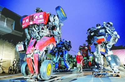11月16日,用废旧汽车及零件做成的机器人伫立在“铁哥们”环保钢雕艺术主题公园内,让人彷佛置身于未来世界。朱克峰带领着他的“铁哥们”环保钢雕艺术团队从事废旧钢铁艺术品制作已经有10年的时间。目前,他们正在浙江省嘉兴市一座占地15亩的旧厂房内,打造一个建筑面积1万多平方米的“铁哥们”环保钢雕艺术主题公园,这也是浙江省内首个以废旧钢铁作为原材料的钢雕艺术主题公园。