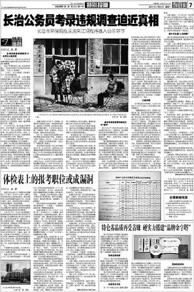 11月20日上午,回到位于山西长治市长子县鲍店镇西王坡西村家中的宋江明已经不再心事重重。 11月19日19时23分11秒,山西人事考试网首页更新了头条文章:“关于拟录用宋江明为长治市环境保护局公务员的公示”。这标志着,在参加山西省行政机关2011年录用公务员考录过程中“被贫血”的山西长治籍考生宋江明的录用程序进入了公示环节。 这一天,距离宋江明首次自行验血的8月19日正好3个月;距中国青年报刊发报道《宋江明求职验血记》整整10天。 11月18日下午举行的长治市人社局全系统干部大会上,党组书记、局长陈皎将此次考录违规事件定性为“案件”——因为该事件对公务员考录工作的秩序和形象造成了“破坏”,且相关责任人可能存在违法问题。“此外,我们已和用人单位——长治市环保局局长李新春取得沟通。他表示,欢迎宋江明的到来。”陈皎说。 |