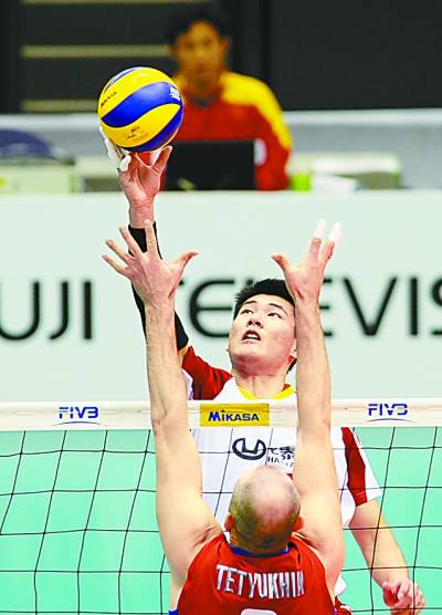 11月21日,中国在日本举行的男排世界杯比赛中,以0∶3不敌俄罗斯队。图为中国男排队员陈平(上)在比赛中进攻。