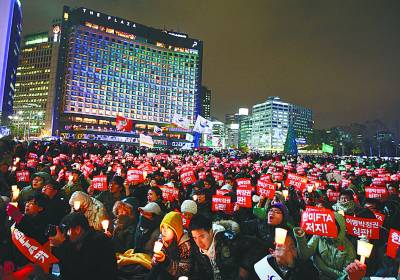 11月23日,韩国民众在首都首尔举行大型示威集会,抗议前一天国会通过的韩美自贸协定履行法案。
