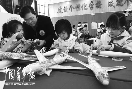 12月18日,在北京学生特色科技活动展示会上,一位老师正在给学生指导飞机模型涂绘。本次展示会吸引了2000多名北京市中小学师生前来参观。