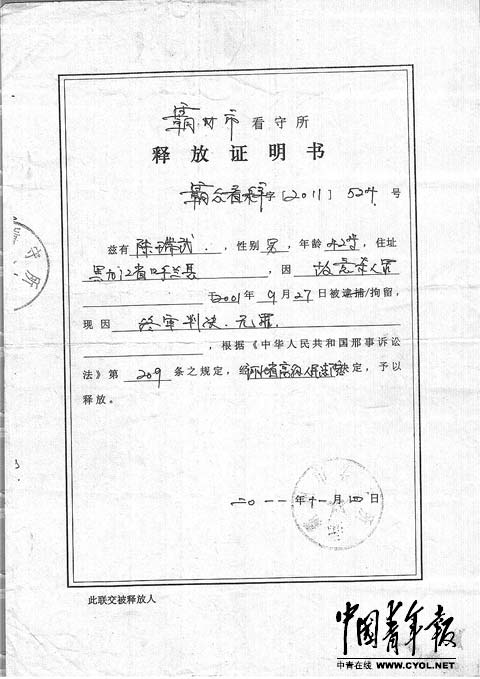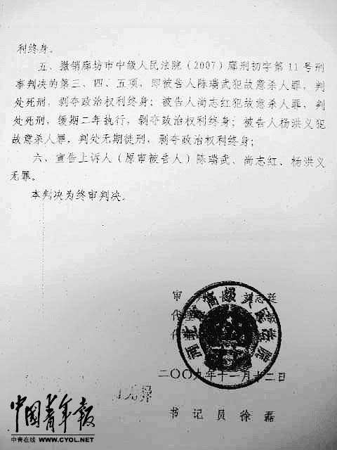 “宣告上诉人(原审被告人)陈瑞武、尚志红、杨洪义无罪。” 2011年11月4日上午,当廊坊市中级人民法院宣读这份长长的判决书时,45岁的杨洪义听到最后几句时,哑然痛哭。 这个结果他等了10年,但若按照判决书上显示的日期,他只用等8年就够了。 这份由河北省高级人民法院作出的、委托廊坊中院宣判的终审判决书,其末尾显示,“诞生”日期是2009年11月12日。 “两年来,这份判决书究竟去了哪儿?谁偿还我们被无辜多关的两年?” 然而,当霸州市看守所的铁门重重关上后,曾经被控故意杀人的三人,除去脚镣、重获自由和一纸标明11月4日的《(无罪)释放证明书》外,没人再对他们命中“蒸发”的两年,给出任何解释。 六次“过公堂”,十年羁押 从死刑、死缓、无期徒刑到无罪,陈瑞武、尚志红、杨洪义几经跌宕的命运,肇起于十多年前的两起灭门惨案。 1995年年底,霸州市胜芳镇一户居民杨长林及儿子杨山、杨雪松三人均在家中被杀;2000年12月,同样在胜芳镇,镇税务稽查队长刘德成及妻王俊铃、儿子刘根三人在家中被人杀死。经当地警方调查,两起灭门案的“主凶”,被锁定在同一个嫌疑人身上——其时在刘德成家对面开小吃部的黑龙江人原伟东。 2001年9月27日,霸州市公安局以涉嫌故意杀人罪将原伟东刑事拘留,同年12月15日将其逮捕。陈瑞武、尚志红和杨洪义,因被怀疑和原伟东一起参与了对刘德成一家的灭门案,同时遭到拘留、逮捕。在这前后,另有3名犯罪嫌疑人也“卷入案中”。至此,两起灭门案涉及的被告共7人。 更令陈瑞武等三人没有想到的是,横在他们和其他4名被告面前的,将是一场长达10年、6次“过公堂”的司法马拉松。 2002年年底与2003年年初,廊坊中院将两起灭门案合并审理。2003年6月一审判决陈瑞武、尚志红、杨洪义与“主凶”原伟东犯故意杀人罪被判处死刑。 涉案的7名被告均不服,而向河北省高院提起上诉,同年12月,省高院以“有的事实尚不清楚”为由,将两起灭门案发回重审;2004年6月2日,廊坊中院进行了部分改判,除陈瑞武、原伟东等三人维持死刑外,尚志红被改判死缓,杨洪义被改判无期,其余两名被告被判无罪。 5名被判有罪的被告“依然坚信自己是无辜的”,于是再次上诉。2006年12月,河北省高院再次将案子发回重审。廊坊中院2008年4月23日作出第二次重审判决,结果与4年前第一次重审判决一模一样。 这已是陈瑞武等人第五次因为自己坚称的“从没做过的事情”而“过公堂”。在河北省两级法院的“几来几往”中,三人已在看守所里被关押了近8个年头,时针指向2009年。 2009年5月14日,河北省高院终于直接提审此案。2009年11月12日,这次审理的结果——一份编号为(2008)冀刑四终字第142号的终审判决书最终“诞生”了。 该判决书显示,对第一起灭门案,“原判决认定基本事实清楚,基本证据确实”,原伟东及另外一名被告故意杀人罪成立;对第二起灭门案,由于“各被告人在作有罪供述时,所供情节存在诸多矛盾……本起犯罪缺乏客观性证据”,因此依法撤销了廊坊市中院对陈瑞武、尚志红、杨洪义的有罪判决,而宣告三人无罪。 “我就知道自己没罪,10年来我一直知道。”在电话中,重获自由的杨洪义向中国青年报记者反复诉说,他能料到自己无罪的结果,但没料到距离自己亲耳听到这个结果,“比判决出来的日子,能足足晚上两年”。 终审判决书“神秘失踪” 两年来,这份仅有20页、却决定了7名被告命运的终审判决书,在陈瑞武等人和他们的辩护律师眼中,一直处于“神秘失踪”的状态。 “从判决书作出来后,就没有人确切地知道它在哪儿。”三人的辩护律师都向中国青年报记者表示,“目前能肯定的只是,它是在河北省高院和廊坊市中院间‘失踪’的。” 陈瑞武告诉记者,2009年5月,河北省高院的那次“直接提审”,一度令他们充满希望。但开庭半年后,结果仍杳然无息,几名被告的家属和律师坐不住了,开始通过各种途径探询。 最先获悉判决已出的是陈瑞武的辩护律师、天津瀚洋律师事务所律师贾磊。2009年12月,他主动联系河北省高院刑事审判四庭主管该案件的法官王惠敏时,被告知“案子判下来了,结果改动很大。” 这个消息让他很兴奋,但随后便遇到了个麻烦——判决书在哪儿?何时宣判? “问高院法官要判决书,就说已经委托本案的初审法院——廊坊市中院宣判了,何时宣判要问中院。”贾磊说。但随后几个月,一直没有宣判的迹象,坐不住了的贾磊多次致电廊坊市中院“探寻”这份判决书的下落,但“中院始终说不知道,没见着。” 终审判决已出的消息很快在被告人的家属和律师间传开,更多人加入了“寻找判决书”的行列。 原伟东的辩护律师、北京京都律师事务所律师张小峰告诉记者,2010年二三月间,他曾往河北省高院打了不下四五次电话,“但每次王法官都表示,判决书早就寄到廊坊市中院了”;2010年5月13日,贾磊和张小峰干脆去廊坊市中院“走了一趟”,中院当时审理此案的徐兵法官表示帮着“问一问”,但两人留下联系方式后,便再没接到回音;贾磊告诉记者,同年5月25日,他又给廊坊市中院打了电话,“中院当时审理此案的刑事审判一庭依然答复说:‘不知道委托宣判这回事儿’。” 此时,距离这份判决书上标示的“诞生日”,已逾半年。 同一时期,霸州市看守所里的陈瑞武、尚志红和杨洪义,正经受着不知终点的煎熬。“在看守所