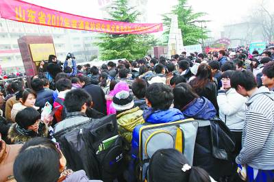 12月18日,济南,众多考生走进山东省普通高校招生美术类专业课统一考试考点。2012年山东省美术统考这一天在17市同步开考。此次美术统考报名人数为39600人,比去年略有下降,该省报考人数已经连续5年走低。