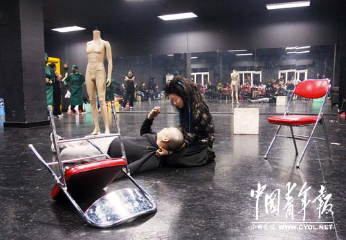 12月16日,北京某剧场,两位年轻演员正在排练话剧《诺亚方舟绑架案》。该剧描摹了在2012世界末日这个“预言”下的世情百态,和灾难背景下底层小人物的酸甜苦辣及爱恨情仇。