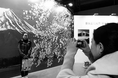 一名参观者16日在“活力日本”展上一块印有富士山的大幅展板前留影。新华社记者 刘金海摄