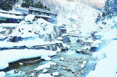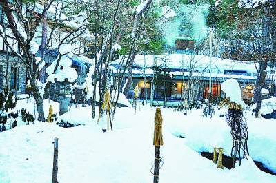 刚下过很大的雪,但小溪并不结冰,水中弥漫着温泉带来的热气