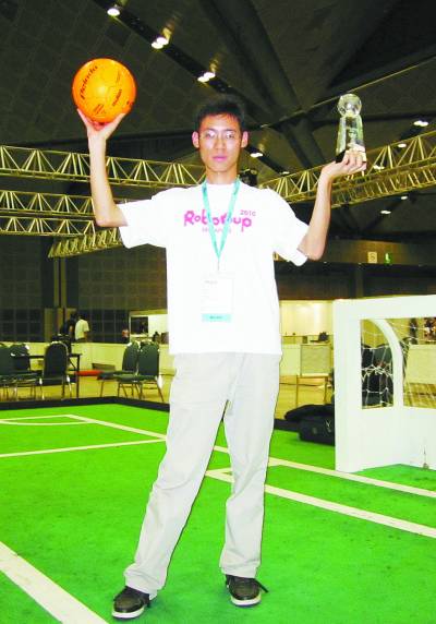 黄斌是一个典型的工科男:带着四方形的眼镜,淳朴得有些“呆”不善言辞,与女生说说话就脸红。 而就是这么个不起眼儿的“工科男”,却带领着他的机器人足球队打进了国际上最具影响的机器人世界杯足球赛之一——RoboCup-机器人世界杯比赛,并两次获得冠军。 一次不经意的选择成为开启他潜能的钥匙 在进入water队之前,黄斌对机器人并没有什么特别的了解。 高考完毕,凭着当年曾经拆装过电视机的朦胧兴趣,黄斌填报了北京信息科技大学的机械设计制造及自动化专业,并被录取。 大一下学期的时候,他仍然是凭着那点儿朦胧的兴趣进入了该院的机器人团队water。 没想到这次看似不太经意的选择就像为他找到了一把钥匙,一下子开启了他的潜能。 为了能让一个由5个机器人组成的球队完成一场足球比赛,必须集成各种各样的技术,包括自治智能体的设计准则、多智能体合作、策略获取、实时推理、机器人学以及传感器信息融合等。 黄斌担任队长的water队,队员全部都是刚刚升入大学不久的本科生。由于知识有限,黄斌和队员们只能通过一次又一次的实验来确定数据进行编程。一个小版块的实验,所花费的时间往往需要一到两个星期。 而在很多国际强队,队员有教授、博士生、硕士生,很多人把这当成了终身爱好,十几年甚至几十年一直从事机器人方面的研究,参加RoboCup比赛是他们对自己研究成果的一个检验。 实力高下,一目了然。 所以,当2010年water队来到新加坡参加第14届Robocup机器人世界杯时,没有人看好他们。 “人家一个队从本科生到教授一共30多人,各方面保障都很全面,甚至连冰箱都拉去了,我们真的和人家强队没法比。”指导老师赵勇回忆了当时的情形。 比赛一开始,water队就遇到了所有队伍中实力最强的荷兰爱因霍芬科技大学(Eindhoven University of Technology)队,差一点儿就在第一轮中被淘汰出局。 但是,黄斌他们并没有被打蒙。“我们调试程序,调整机器人的状态。”黄斌说。一步步稳扎稳打,water队出乎意料地打进了决赛,决赛的对手还是老冤家荷兰爱因霍芬科技大学队。上半场在3:3的比分中结束,下半场比赛即将结束时比分变成了5:5,这时候water队有了一个发边线球的机会,球弹到对方机器人身上变了线,一个射门球进了,但同时,终场的哨声响了。 “场上安静极了,”黄斌说,“我们不知道这个球会不会算数。” 最终裁判宣布water队胜利了。 “胜利完全出乎意料”,所以,当他们得知要站上冠军领奖台时,大家开始满场找国旗,最终在香港队借到了一面。 第一次的冠军可能具有偶然性,2011年黄斌再次跟随water队参加比赛时,他们的技术更加全面了,尤其在程序设计上,黄斌他们的设计针对性更强。“能做到机器人全场范围内射门的,全世界只有我们一个。”黄斌说。 这一次,water队毫无悬念地再一次获得了冠军。 如今已经大四的黄斌,正在研制机器人自主守门装备,他们打算在今年7月参加RoboCup时,将其应用到比赛之中——在RoboCup的比赛中,从未有哪个国家的团队获得两次以上的世界冠军,water队希望能打破这个魔咒。 “只要努力,就一定做得好” “弹指一挥变风云,壮志凌云掌乾坤。”这是黄斌为自己的网络个人空间所取的名字。字里行间,张扬的自信和豪气尽显其中。 在他所熟悉的领域,黄斌像变了一个人,不再是那个腼腆的、跟女生说话都会脸红的人。 “我比较自信,也可以说是自大,”黄斌如此直截了当地说,“就是有时候觉得自己做事,只要努力,就一定做得好。不到最后的结果出来,都不会放弃、认输。” 高中时,英语是黄斌“弱科”。高三时有次月考,黄斌的英语只考了84分(满分150)。“当时我就疯了,这个分数还参加什么高考啊?”在接下来的一个月里,黄斌全身心投入英语学习中,将各省前一年高考的英语真题全部做了一遍。功夫不负有心人,第二次考试,黄斌的英语考了119分。此后,他的英语成绩就一直保持在120分左右。 这股子倔劲儿,在他的机器人世界里也常常显现。 作为一个本科生,凭自己仅有的学识“玩转”机器人本不是一件容易的事,还要不断追赶国际领先的技术更是一件难事,而对于黄斌来说,这些还远远不够,他还要不断地创新、不断地攻克难关,使得他们的机器人能更加灵活、更加精确、更加智能、更加稳定。这一切都需要下苦功夫。 “在我们的实验室里,黄斌搭了一张简易的床,他几乎所有的空余时间都是在实验室里度过的。”黄斌的队友、师弟洪博文说。 每次到攻克难题的时候,黄斌满脑子想的都是程序。同时还要请教不同专业的老师和同学。 “我并不是聪明的孩子,所取得的成绩都是努力得到的。”黄斌说。 就这样,黄斌带领着water队给那些冷冰冰的机器人装上了“大脑”,让它们在球场上激情迸发作出精妙配合,给它们设计更为刁钻的射门角度,不断地创造着奇迹,把不可能变成了可能。 “工科男”的最终梦想是环游世界 其实,跟黄斌接触时间越长你就越会觉得,冷静、腼腆不是他的全部。 “你能相信我接下来要说的话么?我在高中毕业录上写下的‘环游世界’,我一直都想实现。”黄斌说。 打开黄斌的网络空间,可以看到近百篇个人日志,从“中国108座名山”到“世界100大奇特建筑”等旅行推介类的文章不一而足,少年对于世界美景的好奇和向往一览无余。 除了“环游世界”的浪漫情怀,黄斌还有一颗敏感温柔的心