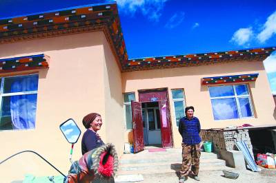 4月12日,青海玉树,牧民扎西丹珠和妻子在自家新居门前。4月14日是玉树地震两周年,玉树将举行灾后重建誓师大会,玉树重建将进入决战和收官之年。微尘/CFP