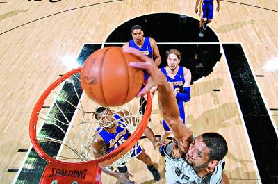 4月12日,NBA常规赛,湖人队以98∶84击败西部排名第一的马刺队。图为马刺老将邓肯扣篮。CFP供图