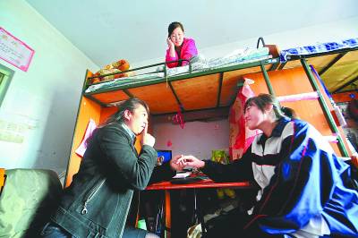 5月8日,刘海涵(左)在长春大学特殊教育学院女子宿舍里看望并辅导学生管晓晶。特教学院的辅导员刘海涵这些天格外忙碌。还有一周时间,她将带领学院的85名聋人学生参加学校和区里组织的两场艺术体操表演赛。