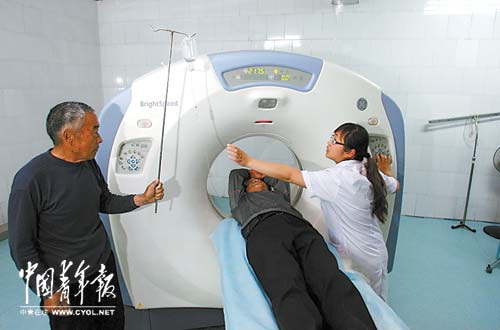 在西辛庄的“濮阳县民生医院”,一位村民一边打点滴,一边做CT检查。