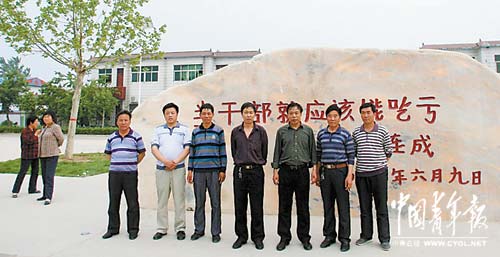 山西的几名村干部来到西辛庄“取经”,并在村支书李连成书写的“当干部就应该能吃亏”的石头前合影。