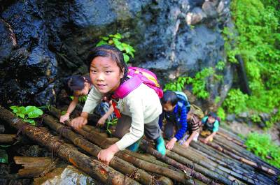 在广西大化瑶族自治县板升乡弄勇村,有一处高达10多米的悬崖,是村里几十名小学生上学的必经之路。每周孩子们风雨无阻,结伴而行,翻越悬崖到村校求学。山里的居民怕孩子上学不便,在危崖处搭建了一个竹排方便他们通行。尽管如此,雨天湿滑,加上山道崎岖,孩子们走路危险,家长们提心吊胆,而这样的状况已经持续了几十年。山里的群众急切盼望能修建一条安全的通道,让孩子们平平安安、高高兴兴地去上学。