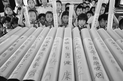 5月30日,山东省淄博市沂源县振兴路小学学生展示用废弃饮料瓶和挂历纸等制成的戒烟宣传模型,上面写着“香烟是魔鬼的契约”、“小小一支烟 危害万万千”等标语。5月31日是世界无烟日,各地学校纷纷开展禁烟主题宣传活动,呼吁人们远离烟草,给孩子们一个无烟的成长环境。