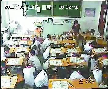 这个班的班主任刘连娜正在隔壁上数学课。她安顿好那里的学生,想起来自己班是外教在上课,来不及放下手里的数学卷子,就跑回六年级2班,推开门,指着站起来的几个学生让他们蹲下,然后又回到隔壁。