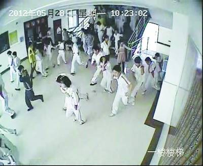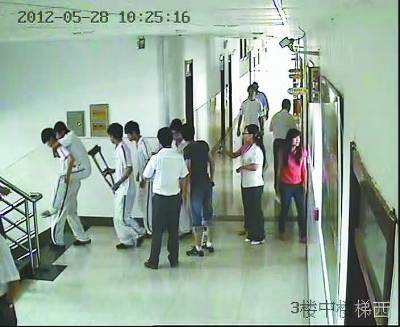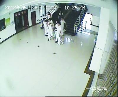 6个人的身影出现在2楼楼梯口的监控录像里,是10点25分27秒。出现在一楼大厅是25分43秒。6个人用40多秒的时间走完了从3楼下来的50多级台阶。